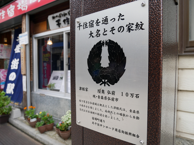 通りの所々にある街頭には、千住宿を通った大名とその家紋が。