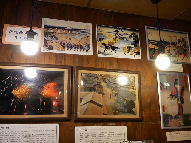 中には昔の北千住を写した白黒写真や、浮世絵に描かれた北千住の街が飾られていました。