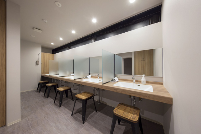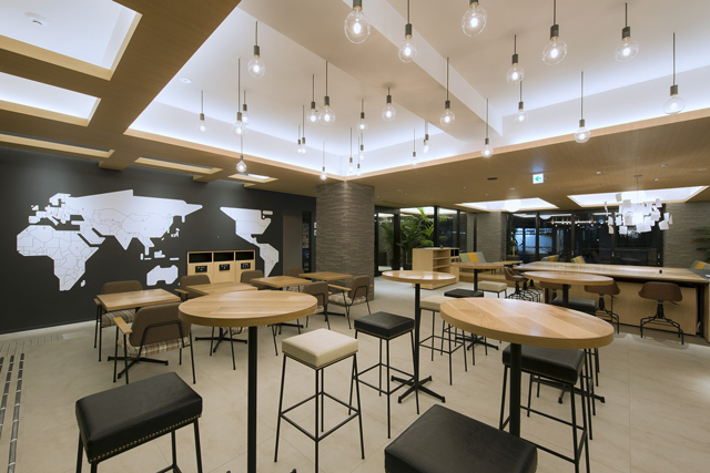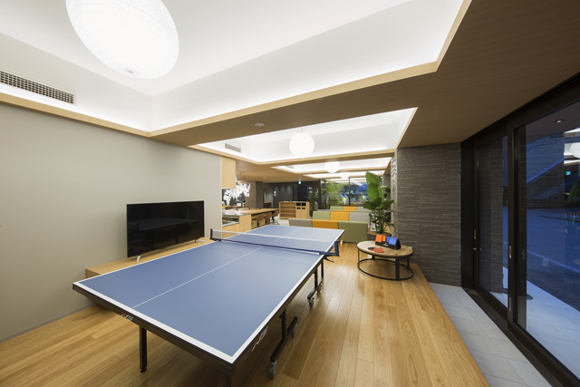 1階共用部は、オープンキッチンを配したダイニングやロビー・縁側を設けてコミュニティースペースとし、宿泊者と居住者・地域の人が自由にコミュニケーションを図れるよう開放。