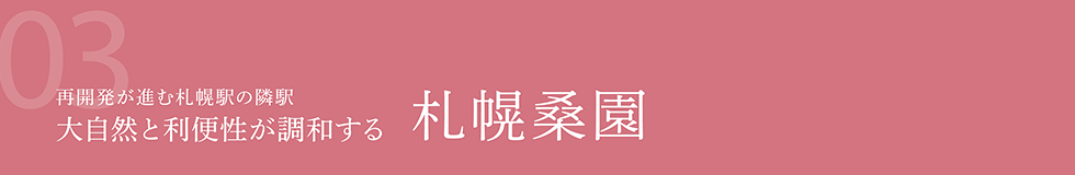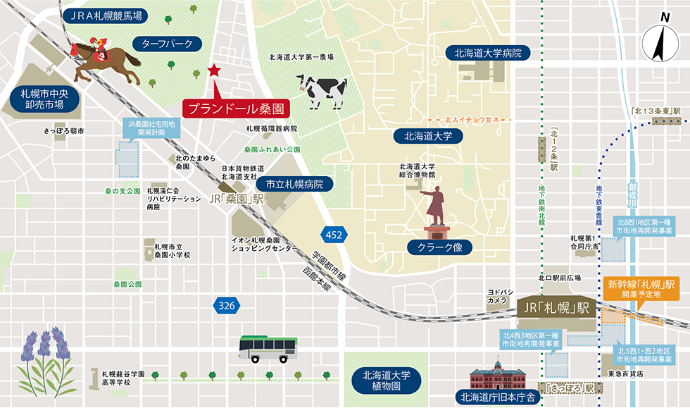 JR札幌駅から西にひと駅、約2㎞の距離に位置する桑園駅。明治時代、養蚕のため桑畑が広がっていたことに由来する地名です。桑園は、マンションが立ち並ぶ都会的な住宅街でありながら、北海道大学の農場や植物園、札幌競馬場などの緑が身近にあり、落ち着いた雰囲気を感じる街です。都心へのアクセスも非常に良く、駅前には大型ショッピングモールや札幌市立病院等があり、生活環境が充実している利便性の高い駅です。特に転勤族など道外から引っ越してくる人に人気が高く、近年では住人が増え、「SUUMO 住みたい街ランキング2023 北海道版」では、第7位と注目が集まるエリアとなっています。