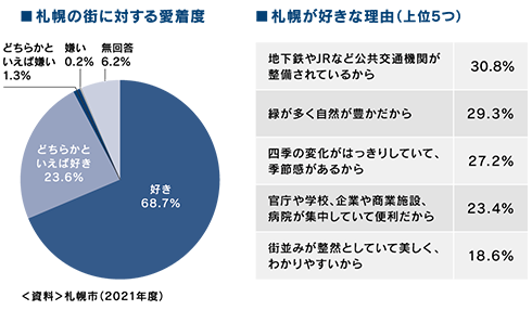 広く市民の意見を求め、長期的視野から魅力あるまちづくりを推進する札幌市。市民意識調査では「札幌の街に対する愛着度」は92.3%と極めて高く、「札幌にすみ続けたい」という市民の安住意欲につながっています。